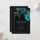 Celebrate your birthday in style with this bold, neon, tropical invitation with silver glitter accents, blue and teal hibiscus, and tropical greenery on a black background. Come on - let's party!