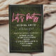 Pink neon inspired "Let's Party" script over boxwood greenery background with custom white text.