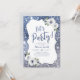 Faux sparkle silver and blue glitter "let's party" script with dusty blue and white floral, elegant and stylish, great invitations for birthday party, holiday party, engagement party or other special occasions.
