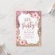 Faux rose gold sparkle glitter background and blush pink floral with "let's party" script in centre, elegant and stylish, great invitations for birthday party, holiday party, engagement party or other special occasions.