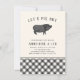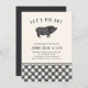 Hosting a BBQ or pig roast engagement party? Invite guests to "pig out" with you with these cool party invitations featuring a vintage style hog illustration and "let's pig out" arched across the top in black lettering. Add your engagement party bbq details beneath using the template fields provided. A plaid bottom border adds a rustic finishing touch.