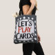 "Let's Play Cards" is a cute text design in grey with black and red text, along with a white accent shape and white textured whimsical dots surrounding it.