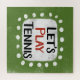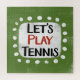 "Let's Play Tennis" is a cute text design with a white accent shape surrounded by white textured whimsical dots.