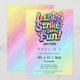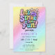 Let's Strike Up Some Fun Bowling Birthday Party Invitation. Roll into fun with these "Let's Strike Up Some Fun" bowling birthday party invitations! Featuring a playful cartoon bowling ball and pins against a dreamy, pastel rainbow background with subtle glitter accents, these invitations are perfect for any kids bowling bash. The vibrant "Let's Strike Up Some Fun!" text is sure to excite your guests and get them ready for a strike. Ideal for any age birthday celebration, these cards invite everyone to join in the excitement at the bowling alley. Make your next birthday party a gutter-balling good time with these unique and eye-catching colorful rainbow bowling birthday invites!
