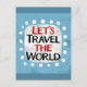 "Let's Travel The World" is a cute text design in blue with black and red text, along with a white accent shape and white textured whimsical dots surrounding it.