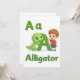 Cute and colorful alphabet postcard featuring the letter A with a friendly alligator and a happy child illustration in a premium cute cartoon style.