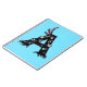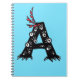 Letter A kids notebook with a cartoon illustration of a cute monster with body forming a capital letter A over customisable blue background. This funny character has many eyes and makes a funny expression showing its teeth. It even has tiny claws on its paws and three red feathers on its head which reveal its quirky personality.