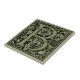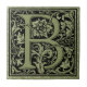 Charming decorative letter B initial monogram calligraphy style typography first letter in black over vintage avocado green book lining with off white Ginkgo biloba leaves.