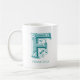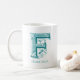 Customisable white coffee mug featuring the letter F in unique teal coloured typography. Add your name using the personalisation feature.