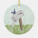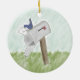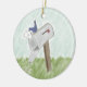 In the pastel drawing on this round ceramic ornament, a blue bird has a letter to send. The plump little bird is holding an envelope with his beak, sitting on top of a grey mailbox that is mounted on a wooden post. The mailbox stands, tilted, in green grass against a pale blue sky. From my original digitally created image.