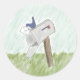 In the pastel drawing on this sticker, a blue bird has a letter to send. The plump little bird is holding an envelope with his beak, sitting on top of a grey mailbox that is mounted on a wooden post. The mailbox stands, tilted, in green grass against a pale blue sky. From my original digitally created image.