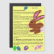 Personalised Letters from the Easter Bunny. Yellow background. Cute brown bunny rabbit with Green, Blue, Purple Decorated Eggs. Letters are signed by the Easter Bunny himself! Cute brown bunny rabbit with big pink ears, nose and mouth, a white tooth, and bushy cottontail, with colourful decorated blue dotted eggs, green white striped egg, and pretty purple egg with green flower, with green text on a spring mint green background. Letter is addressed to Girl's (to address to Boy's simply replace Boy wording with Girl). PERSONALIZE letters by typing in each First Name, Month Year, Hometown, etc. written within body of letter separately, and Add to Shopping Cart. THE LETTER(S) WILL BE "SHIPPED" TO THE ORDERING CUSTOMER. When Easter time approaches simply add a Stamp, and insert into the Envelope (see my store for festive A7 7 1/4" W x 5 1/4" H Easter Envelopes with the colourful Easter Bunny's Official Mail Circle printed on envelope for extra "believe" fun), and Mail the envelope from the Easter Bunny to the child. (Shh! Mailed from the Easter Bunny of course!) Be sure to give yourself enough time for the letter to ARRIVE to the recipient in time to enjoy at least a couple of weeks BEFORE Easter! Or, if ordering the letter last minute (the Easter Bunny can leave their letter inside their Easter Basket). Kids will love their Magnetic Letter from the Easter Bunny to display on the refrigerator, easel, etc. Nice keepsake letter and great family tradition! Kids of all ages will look forward to the Easter Bunny sending them a special “new letter” in the Mail year-after-year! NOTE: If you choose to Personalise the entire letter with YOUR own wording, delete my wording, and make sure the text falls within the art preview safe red dotted lines (you'll notice some sentences may need to be separated by the space bar to fit within safe lines of borders). Original Artwork, Verse Design Copyright © 2013-2016 TamiraZDesigns.
