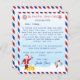 A personalised letter from Santa Claus is something special. This template of a letter from Santa Claus to a child can be customised with your child's name, any achievements, or anything you can think of. You can write a generic Merry Christmas letter or you could praise something specific that the child did, or use it to get your child to go to bed early on Christmas Eve. The design is inspired by air mail envelopes with blue and red borders. You can change all the text of this letter except Santa Claus's signature. If you need more space to write you can use the Post Scriptum on the back of the letter. Don't forget to delete it if not.