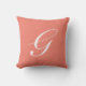Personalised monogram pillow with a classic script letter G on a Coral background. Made in the USA from machine washable cotton or polyester. Perfect for Gladys, Graciela, Gretchen,Georgia, Giselle, Genevieve, Gianna, Gloria, Genesis, Gina, Gabriela, Gabriella, Gabrielle, Grace or anyone else who's name begins with the letter G.
