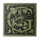 Charming decorative letter G initial monogram calligraphy style typography first letter in black over vintage avocado green book lining with off white Ginkgo biloba leaves.