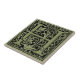 Charming decorative letter H initial monogram calligraphy style typography first letter in black over vintage avocado green book lining with off white Ginkgo biloba leaves.