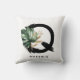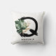 Customisable letter Q monogram pillow featuring watercolor tropical monstera leaf, faux gold foil leaf and black watercolor brush accents. Personalise this tropical monogram pillow by adding your name or other details. This boho letter Q monogram pillow will be perfect as a gift. Other letters are available.