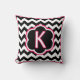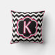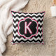 Letter K. Pretty monogram (single inital) throw pillow. Bold black and white zigzag (chevron) stripes, with white and fuchsia detailing and a single initial in the centre.