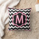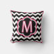 Letter M. Pretty monogram (single inital) throw pillow. Bold black and white zigzag (chevron) stripes, with white and fuchsia detailing and a single initial in the centre.