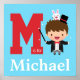 Decorate your kids room wall with this cartoon of a cute little boy in a magician outfit of black tailcoat jacket and red bow tie with a magic wand in his hand. A tiny white bunny rabbit is besides his equally tiny top hat. For kids who love magicians and magic tricks! Personalise with child's name that begins with the alphabet letter M.