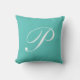 Personalised monogram pillow with a classic script letter P on a Turquoise background. Made in the USA from machine washable cotton or polyester. Perfect for Paige, Peyton, Paula, Payton, Pamela, Priscilla, Paola, Patricia, Phoenix, Phoebe, Piper, Paloma, Paris, Paulina or anyone else who's name begins with an Initial P.