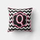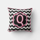 Letter Q. Pretty monogram (single inital) throw pillow. Bold black and white zigzag (chevron) stripes, with white and fuchsia detailing and a single initial in the centre.