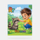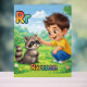 Cute and colourful alphabet poster featuring the letter R with a friendly smiling racoon and a cheerful, playful child illustration.