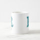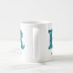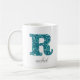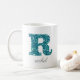 This mug is for the gal who's name begins with the letter R. The design features an aqua blue glittery letter R with your name underneath in a grey script.