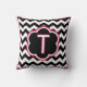 Letter T. Pretty monogram (single inital) throw pillow. Bold black and white zigzag (chevron) stripes, with white and fuchsia detailing and a single initial in the centre.
