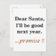 A funny Christmas design that always gets a laugh and looks great on apparel and gifts for adults as well as for kids. This unique Xmas design reads: "Dear Santa, I'll be good next year .....Promise!!"