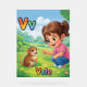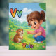Cute and colorful alphabet poster featuring the letter V with a friendly vole and a sweet little girl illustration in a premium cute cartoon style.