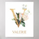Elegant Letter V monogram nursery poster featuring watercolor white cream rose and green foliage.