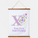 Initial & Name with Floral Design on a Wall-Hanging Tapestry. Personalised with your own name - Design features the recipient's Monogram & Name with Flowers either side in a water colour pastel style. Initial is the letter X. Example shows Xanda.