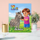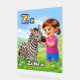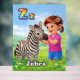 Cute and colourful alphabet poster featuring the letter Z with a friendly zebra and a sweet little girl gently touching the zebra’s face.