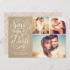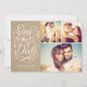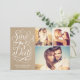 This save the date photo card features a 3-photo collage, swirly hand lettered calligraphy artwork and a faux kraft paper texture. Visit our designer shop to see more!