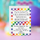 Custom rainbow checked LGBTQ birthday party invitations. Create custom invites to celebrate your birthday with this colourful chequered design. Easily add the name of the celebrant, the date and time. The venue address and either a contact email or phone number for guests to RSVP.