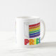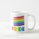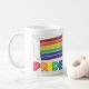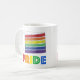 Ceramic mug features an original marker illustration of a classic rainbow layer cake slice, with PRIDE in a rainbow font.