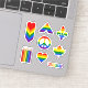 Custom-cut vinyl stickers with a variety of designs in the colours of the LGBT pride flag; the included shapes: a peace sign, hearts, stars, a maple leaf, a fleur-de-lis, pencils, a straight ally sign, and the text pride