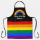 Large apron with an image of an LGBT (lesbian, gay, bisexual, transgender) pride flag and a rainbow; pink, white, and orange design on a black background, with a customisable text template for your own name or message