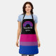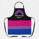 Medium-sized apron with an image of a bisexuality pride flag and a rainbow; pink, purple, and blue design on a black background, with a customisable text template for your own name or message