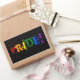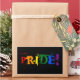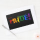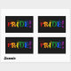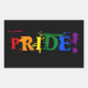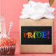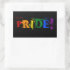 Design with text “Pride!” in colours of LGBT (lesbian, gay, bisexual, and transgender) rainbow stripes pride flag, rainbow love gay pride design on black background