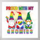 Proud with my gnomies sign in pride rainbow colours over white background. Three gnomes holding a pride flag, a rainbow heart, and many genders sign.
