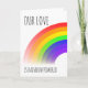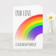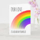 An LGBT themed greeting card for the one you love. Features a bold rainbow and the words "Our love is rainbow powered". Inside is blank for your own message