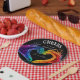 From the vibrant Heart of Pride collection, this round paper plate brings color, celebration, and symbolism to your event. The design features a dynamic, splash‑style illustration of two hands forming a radiant heart, set against a sleek dark backdrop. The bold contrast and fluid motion create an eye‑catching centerpiece that instantly elevates any table setting.