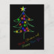 Elegant Christmas Postcard featuring a a Christmas tree with luminescent ornaments and a star on top in the colours of the pride rainbow flag on a black background and lots of rainbow stars on black in the back "Merry Christmas and Happy New Year" is also written in a casual artistic font in the colours of the LGBTQ+ flag