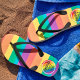 Show your pride with these LGBTQ themed flip flops featuring the wording Pride 24/7 365 in black lettering decorated with a little heart, on a colourful rainbow flag background