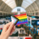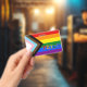 Badge: Rainbow Flag & the "Progress" variation adds a chevron along the hoist that features black, brown, light blue, pink, and white stripes to bring those communities (marginalised people of colour, trans individuals, and those living with HIV/AIDS and those who have been lost) to the forefront; "the arrow points to the right to show forward movement, while being along the left edge shows that progress still needs to be made.