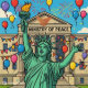 Front: The Statue of Liberty celebrates joyfully in front of the grand Ministry of Peace, surrounded by balloons, fireworks, and festive decorations.