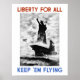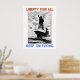 This vintage World War II poster features planes taking off from an Aircraft Carrier as it passes the Statue of Liberty. It reads, "Liberty For All, Keep 'Em Flying". Celebrate American and WW2 History with this digitally restored vintage war poster product from The War Is Hell Store.