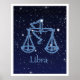 Poster featuring the symbol for Libra in soft silver blue, overlaid with the stars of the constellation, against a starry sky background graded from deep midnight blue to black.